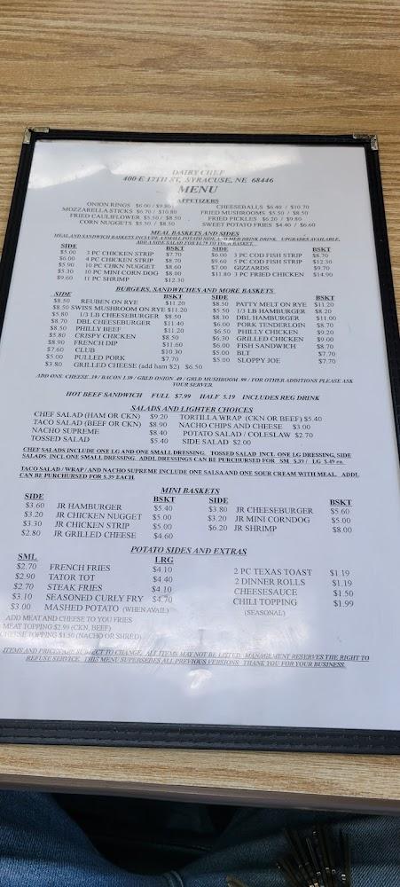 Dairy Chef's menu presents a lovely variety of American fare. Hearty sandwiches, particularly the hot beef, are popular staples. With prices around $6.59, meals offer excellent value. Small bites and hearty meal baskets add to the mix, ensuring that everyone finds something they enjoy.